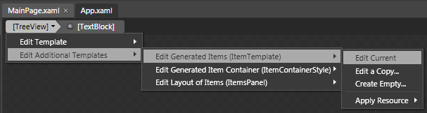 - There are at least three ways to navigate to the Edit Current Template menu but I find the fastest is clicking on the TreeView breadcrumb underneath the MainPage.xaml tab (illustrated below)